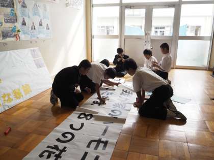右の写真は、各クラスの書記のメンバーで、合唱コンクールのスローガン幕を作っている様子です。この幕は来週の合唱開きで使い、その後、本番の幕を作る作業に移っていきます。秋も勉強や行事に大忙し。風邪に負けず、元気に乗り越えましょう!