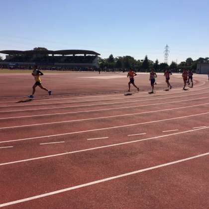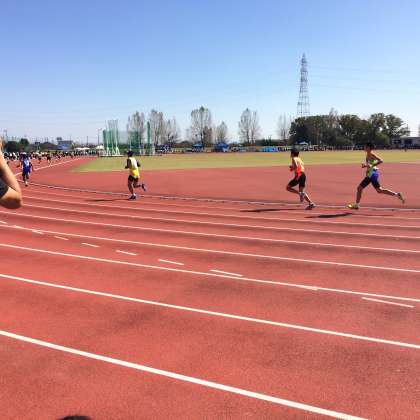 第一走者がトラックに戻ってきました。間もなく第二走者にタスキが渡ります。