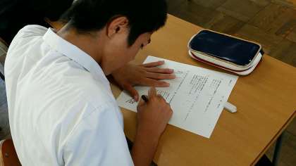 朝の学習の時間に、本日は基礎学力テストが行われました。科目は国語です。明日から職場体験学習ということもあり、内容は"敬語"で行いました。