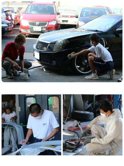 板金ブース、塗装ブース、整備ブースに分かれて作業しています。他では味わうことができない体験をさせて頂いています。