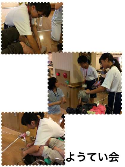 お風呂から出てきたお年寄りの方たちの髪を乾かしたり、靴を履かせたりしています。(写真左)