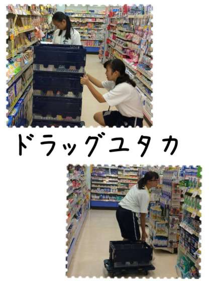 商品出しをしています。2日目となり、商品の場所も覚えたようで、スムーズに商品を並べています。(写真右)