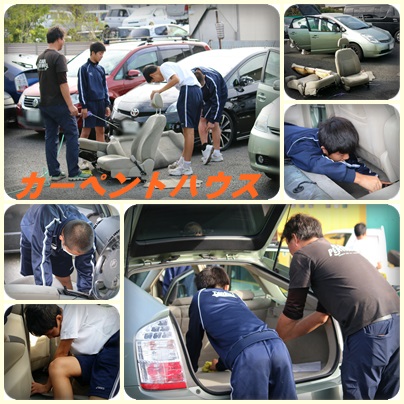 カーペントハウス(オートグランディー)では、本日は車の清掃をしました。普通の洗車や、掃除機をかけるのではなく、シートを図面を見て外し、マットなど、内装を外し、丸洗いを一日かけて作業しました。同じようなねじ一つでも、大きさが異なることで戻すのことにも一苦労な様子でした。