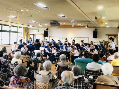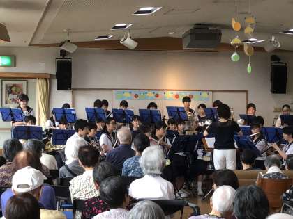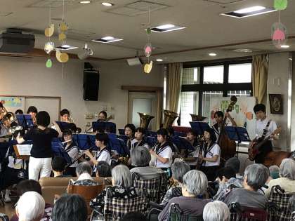 ブラスバンド部が一期一会荘へ慰問に出掛け、行なった演奏会を参観しました。職員の方を含め、100人程の方々に聴いていただきました。