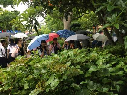 雨が降っていますが、乗り物の列に元気に並んでいます!