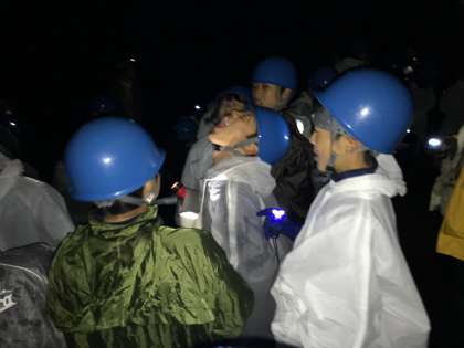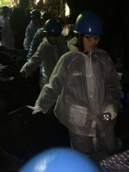 洞窟の中はかなり寒く、氷が張っています。長い年月をかけて溶岩の間を通って来た水を口でキャッチすることもできました。