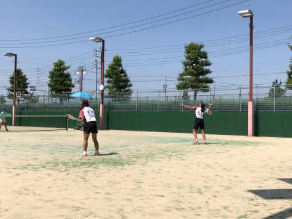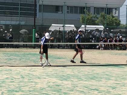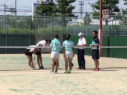 ソフトテニス部男女とも1組目を快勝、男子は2組目もリードしています。