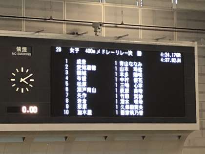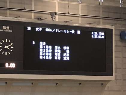 水泳部は今日、明日と県大会が行われています。女子400メートルメドレーリレー決勝です。
