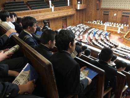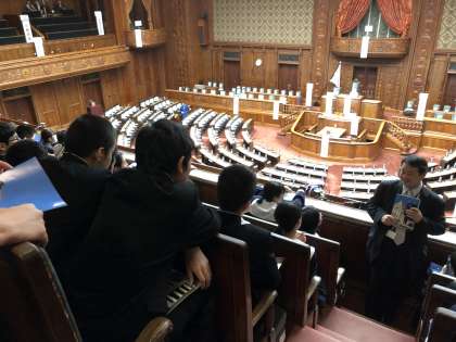 国会見学、本会議場の傍聴席に着席し、説明を聞いています。