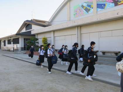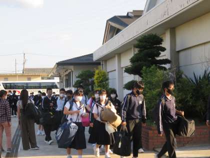 全クラスのバスが無事に岩倉中学校へ到着しました。