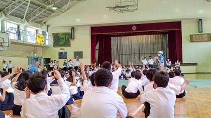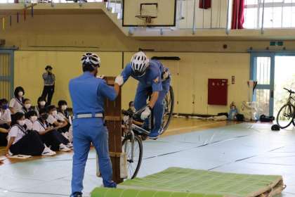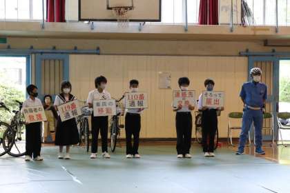 江南警察署の方々に来校していただき、自転車のマナーについて学びました。