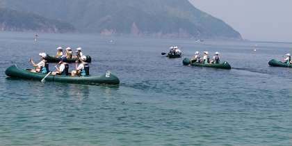 カヌーとボートに乗って気持ちよさそうです。みんな海を楽しんでいます。
