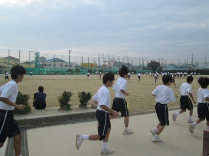 運動場ではバスケット部を中心に大きなかけ声を出してランニングなどの基本練習を行っています。清掃などボランティア活動をしている生徒の姿もあります。