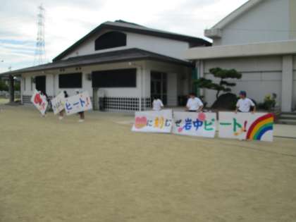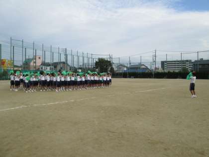本日7時間目に運動場で体育大会のスローガン発表・ブロック旗の披露に引き続き、応援練習を行いました。