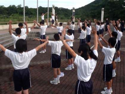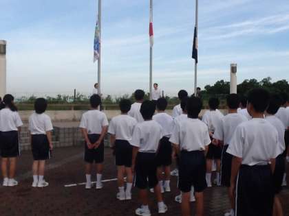 スローガン「学ぼう美浜の自然、深めよう私たちの絆」を記した学年旗が掲げられました。