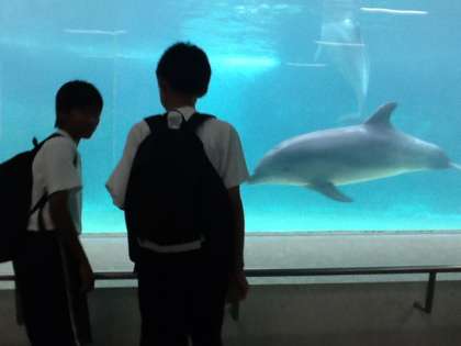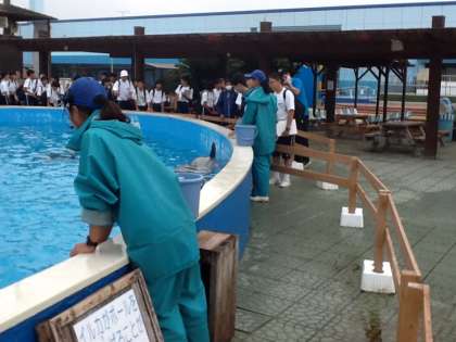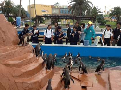 イルカやアザラシにタッチ、ペンギンの餌やりなど、生き物との触れ合いを楽しみました。