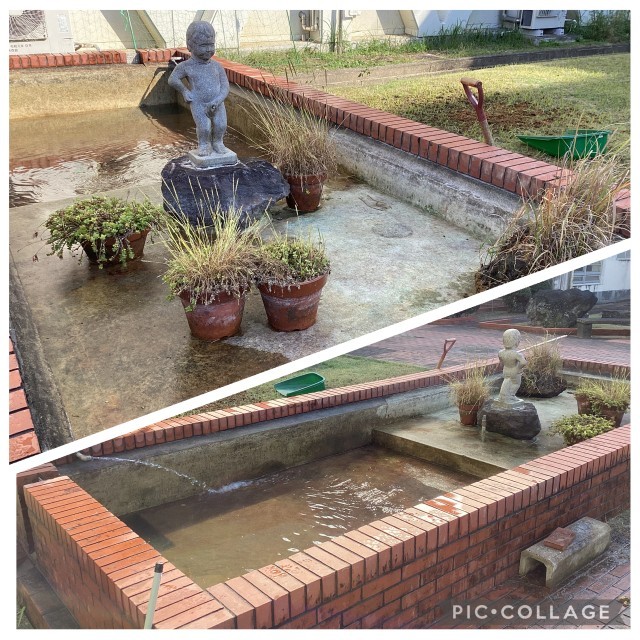 中庭の池を綺麗にしました。中にはカメが1匹すんでいます。見つけられるかな。