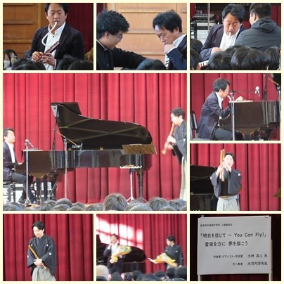作曲家・ピアニスト・作詞家である小林真人氏と尺八奏者である大河内淳矢氏をお招きし、人権講演会を行いました。小林氏の温かく優しい語りの中に、力強い演奏、心に響く音色が体育館に響き渡る、とても居心地のよい時間となりました。「ふるさと」の演奏を聴きながら、これまでの人生を振り返り、いつもそこには子ども達の笑顔があったと温かい気持ちになりました。