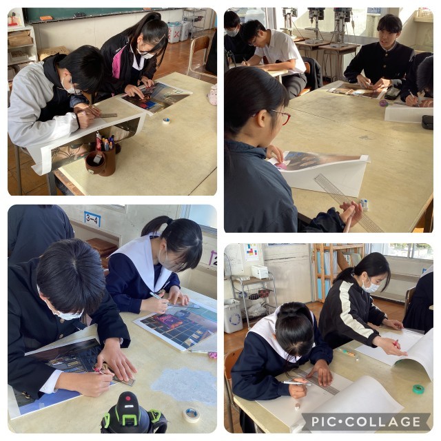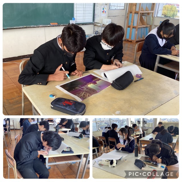 3年生 美術 公開日 2025/12/16 更新日 2025/12/16 南中 JUST NOW ! 学校内の思い出の場所を遠近法を用いて描いています。それぞれの思い出が形となって出来上がるのが楽しみです。