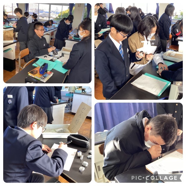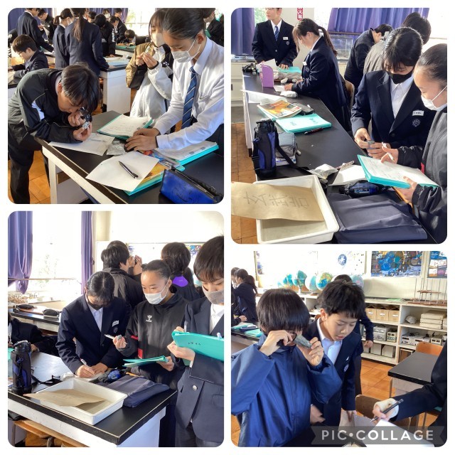 肉眼やルーペで見たり、触ってみたりして、火山岩について調べていました。