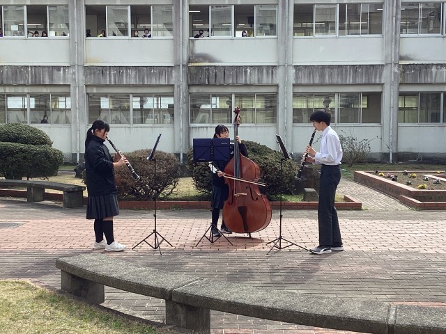 昼休みの中庭にて、吹奏楽部によるミニコンサートを行いました。クラリネットと弦楽器のアンサンブルが柔らかな音色を響かせ、校舎の窓や渡り廊下から多くの生徒が演奏を楽しみました。曲目は「ミニチュア・スイート」。短い時間ではありましたが、校内に心地よい音楽が広がり、穏やかなひとときを共有することができました。