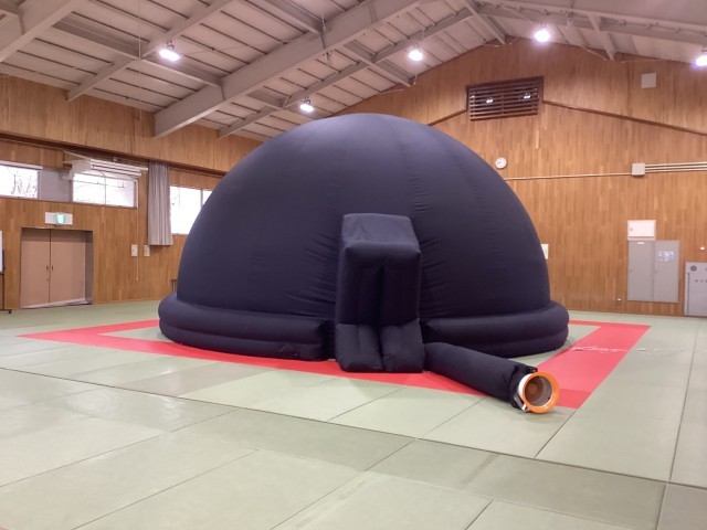 星見の会の皆様をお招きし、プラネタリウム学習を行いました。武道場に現れた大きな特設ドームに、生徒たちは入る前から興味津々。暗闇に映し出された今夜の星空や星座のお話、そして3Dメガネで見る立体的な宇宙の姿に、「わあ、すごい!」と大きな歓声が上がりました。月のクレーターや木星の縞模様を間近に感じ、宇宙の神秘に触れたこの時間は、生徒たちにとって忘れられない貴重な学びとなりました。