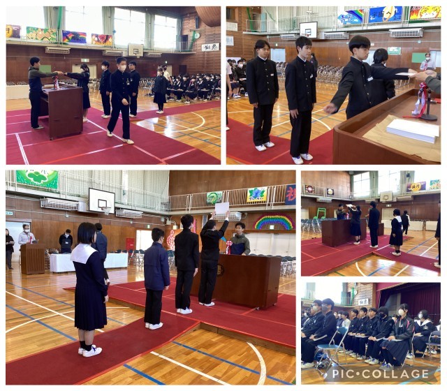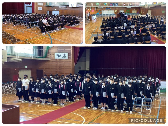 体育館での卒業式練習です。明後日に卒業を迎える3年生は、ピリッとした空気の中で、式練習に臨んでいます。南中で過ごす残りの日々を、仲間と共に温かい気持ちで過ごせることを願っています。