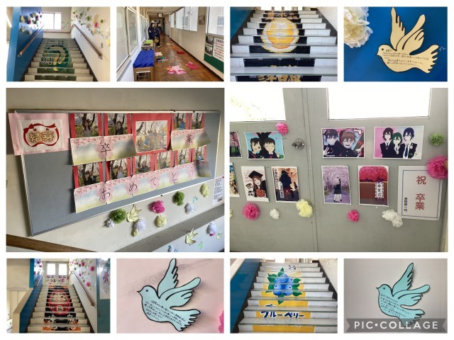 3年生の下校後、1・2年生が明日の式に向けて心を込めて準備を進めました。1年生は学校周りの清掃を行い、来校される方が気持ちよく迎えられるよう環境を整えました。2年生は体育館の清掃や椅子の整頓、廊下や階段の飾り付けを担当し、手作りの装飾で学校全体が温かい雰囲気に包まれました。3年生の門出を祝う気持ちを胸に、どの学年も協力して丁寧に準備を進めていました。