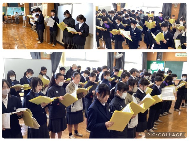 1年生 合唱練習 公開日 2026/03/17 更新日 2026/03/17 南中 JUST NOW ! 朝の時間を活用し、1年生が合唱練習に取り組んでいます。曲は「地球星歌」。次の新入生を迎えるにあたり、先輩として心を一つに、想いを込めて歌声を届けたいという気持ちがあふれています。これからの成長が楽しみな、意欲あふれる練習風景です。