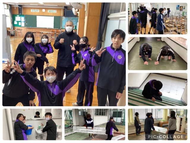 年度末の大掃除を行いました。1・2年生のみんなで教室や廊下、特別教室など学校全体を分担して清掃しました。床磨きや机の整理、細かな部分まで丁寧に取り組み、1年間お世話になった校舎を感謝の気持ちで整えることができました。