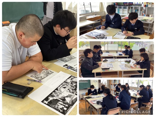 2年生美術の授業では、ピカソ作『ゲルニカ』の鑑賞を行いました。教室背面に大きく拡大した作品を掲示し、全体構成や人物・モチーフの表現に注目しながら鑑賞を深めました。戦争の悲惨さや作者の思いを読み取り、感じたことや気づきを言葉にすることで、作品と主体的に向き合う時間となりました。