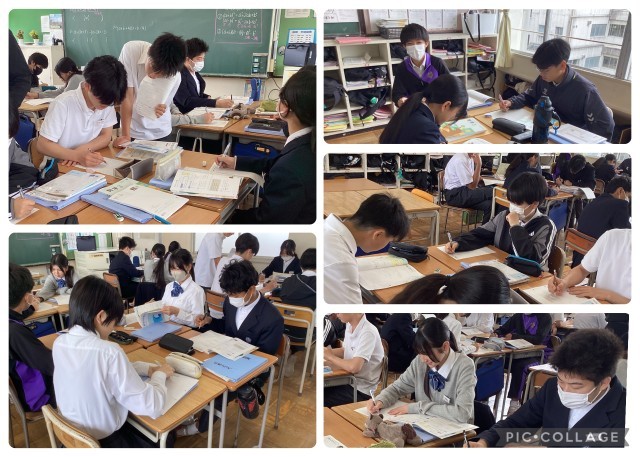 今日は挑戦問題に取り組んでいます。黒板に書かれたヒントを頼りに、仲間と話しながら取り組んでいます.