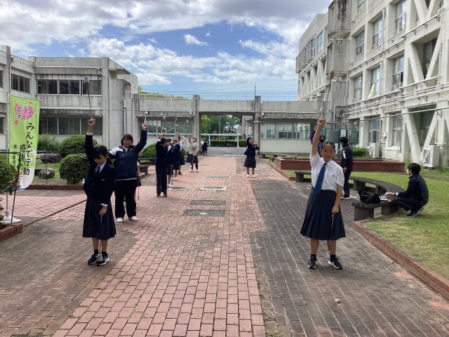 昼休みの中庭、5月中旬の自然教室に向けて、トーチトワリングの練習をしています。心を合わせて、音楽に乗って演技をしています。