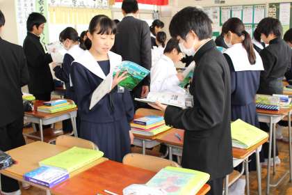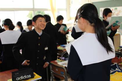 1年生 英語の授業風景です。 ペアを交代しながら、役割を決めて会話の練習です。