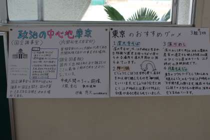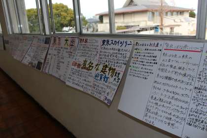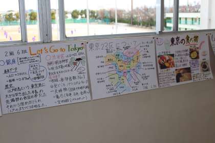 2年生の廊下に、テーマ別に調べた「東京」の情報が並びました。