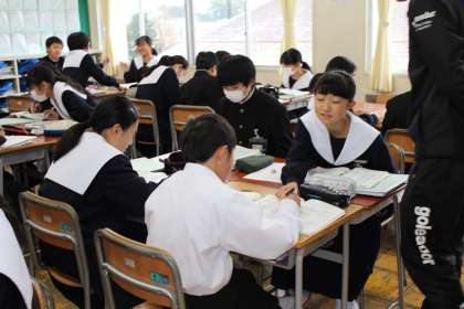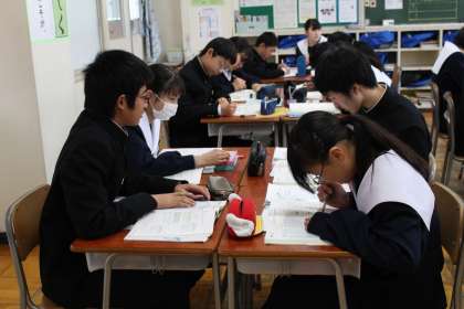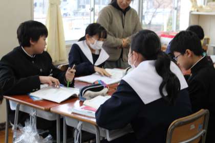 1年生 数学の授業風景です。 「度数分布表」を見ながら、分析をします。