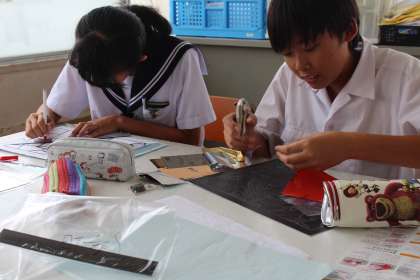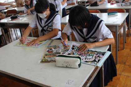 2年生 美術の授業風景です。 ステンドグラスをイメージした作品に挑戦しています。