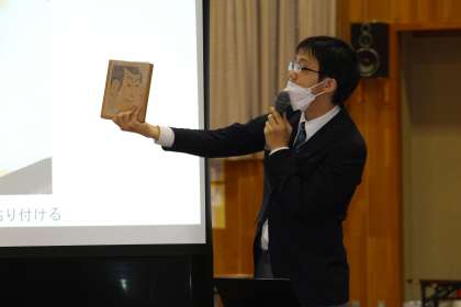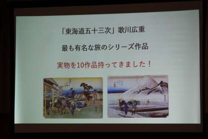 2年生 MOA美術館所蔵作品鑑賞会 第1部 公開日 2022/03/10 更新日 2022/03/10 2年生 箱根にあるMOA美術館のアウトリーチ事業で、毎年岩倉市の2中学校が所蔵作品の実物を鑑賞させてもらっています。 今年も2年生を対象に、その会を開いて頂きました。 見せて頂いたのは、歌川広重の浮世絵「東海道五十三次」のうち10点と、明治、大正、昭和にかけて風景画家の第一人者として活躍した吉田浩の作品3点です。 第1部は学芸員の方の、楽しく分かりやすい説明でした。