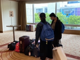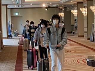 生徒が部屋から出てきました。 朝食会場に大きな荷物を置いて入ります。