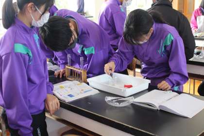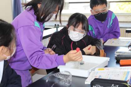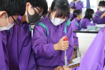 3年生 理科の授業風景です。 酸性の水溶液と、アルカリ性の水溶液を混ぜたときの変化の様子を追跡します。