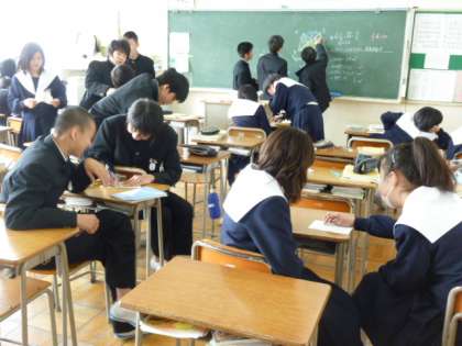 左…2年3組 数学:「図形」の証明問題を解いています。クラスを2つに分けた少人数授業です。教室のいたるところで教え合う姿が見られました。