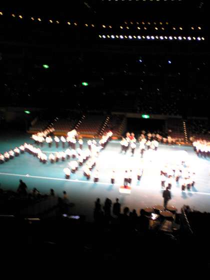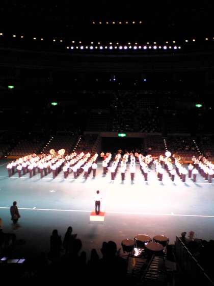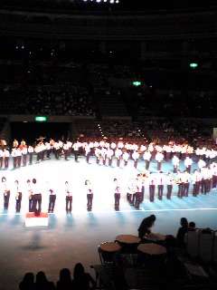 日本ガイシホールで行われる「動くコンサート」に岩倉南部中の吹奏楽部も参加しています。広いアリーナで本番前の合同練習の様子です。