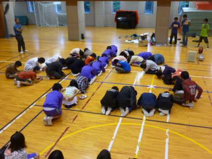 次に「モジモジゲーム」です。クラスで一文字ずつお題をもらい、全員で一文字つくりました。
