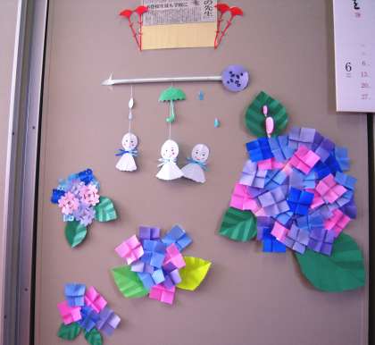 (中央)本を参考にオリジナルもプラスしてこんな素敵な壁面飾りが出来上がりました。相談室入り口にあります。知っていましたか?梅雨の暗い気分がパッと明るくなりますね。