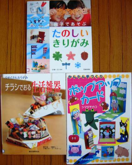 (右上)その他にこんな本もあります。『かんたん手づくりポップアートカード』、『チラシでおる生活雑器』、『親子であそぶたのしいきりがみ』(図書館で出番を待ってます。)