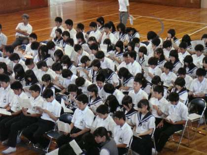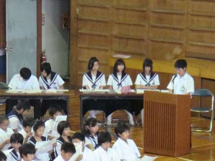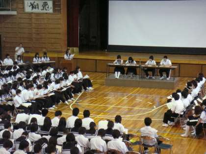テストが終わった午後、体育館で前期生徒総会を実施しました。執行部によるアンケート報告や生徒会予算、専門委員会の各委員長による活動計画などの提案がされました。その後、執行部からマフラーの着用ルールの再確認、制服の着こなしの確認、マスコットを段階的になくす提案がされ、全校生徒による活発な意見交換がなされました。