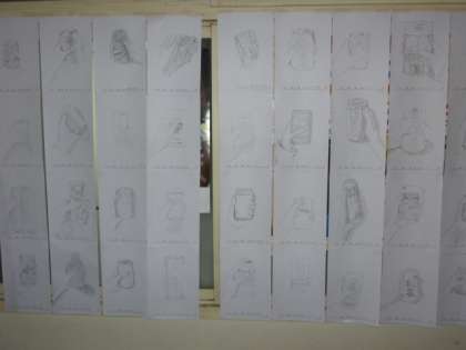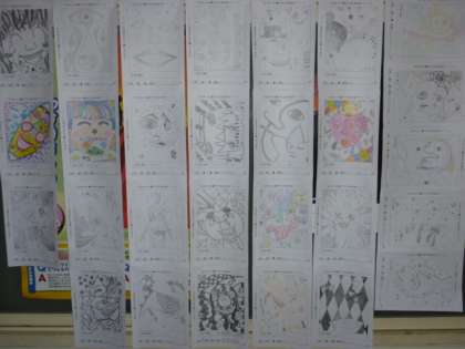 只今、本館1階学習室、相談室前に、美術で取り組んだ作品のうち優秀作品(全学年)を展示しています。