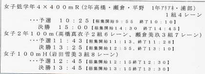 明日は「西尾張陸上大会」 公開日 2010/07/02 更新日 2010/07/02 南中 JUST NOW ! 明日(7月3日)、一宮総合運動場において、西尾張陸上競技大会が行われます。 本校からの出場選手と競技時刻は下のとおりです。健闘を祈っています。 応援よろしくお願いします。