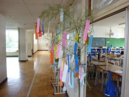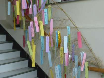 本校の本館階段や南館廊下には、笹の七夕飾りがあります。個性豊かな願い事が多々あり、気分を盛り上げています。