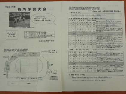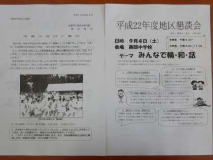 体育大会の案内を配布します2 公開日 2010/09/01 更新日 2010/09/01 お知らせ 本日から生徒が地域の方々にお配りするプリントは2枚です。 黄色…体育大会のプログラム(両面) 白色…体育大会の案内(表面)地区懇談会の案内(裏面) HP右側の「配布文書一覧」からもご覧いただけます。 ※「地区懇談会の案内」は既に掲載してあります。